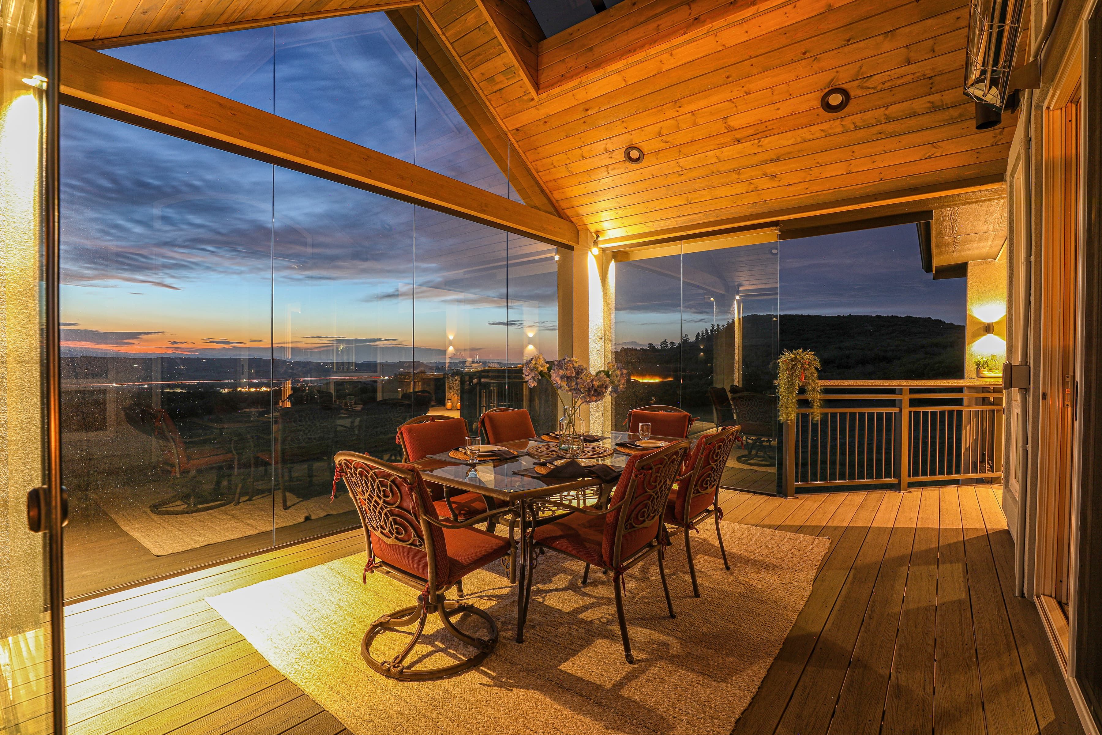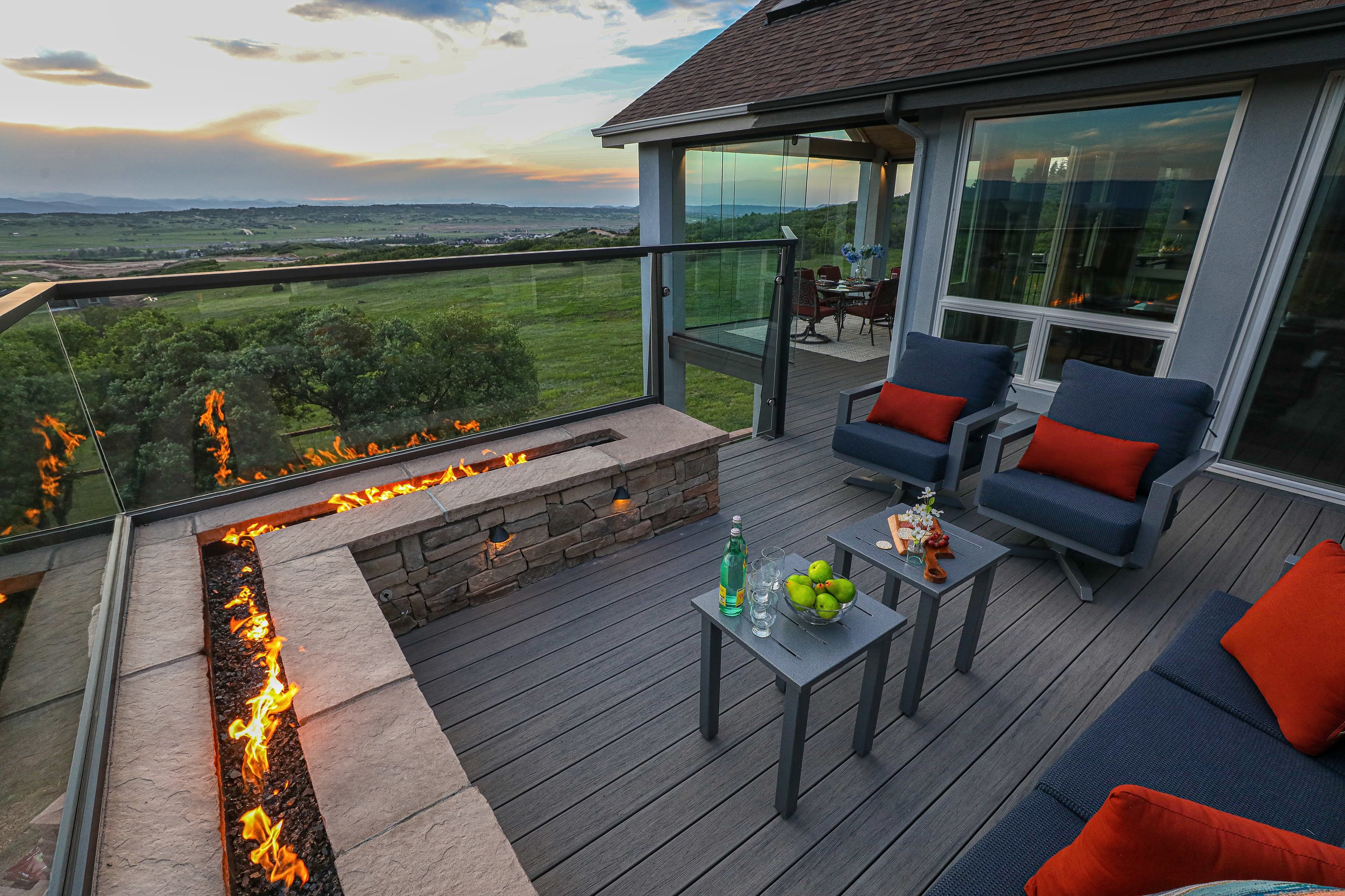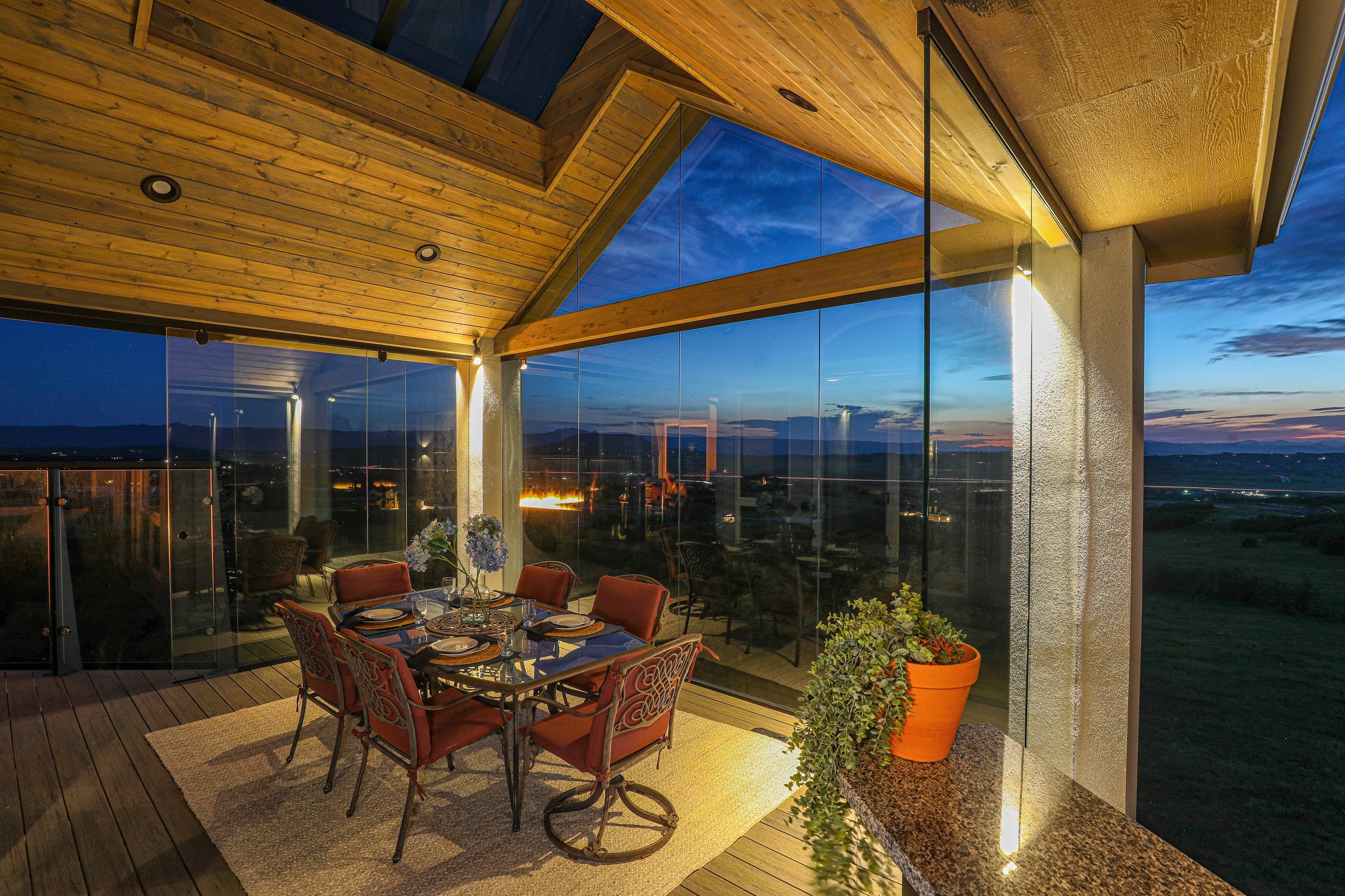 This home has incredible unobstructed views but wind and weather kept the homeowners from using their existing deck. By updating and refining the original space, the family can now enjoy the stunning vistas they fell in love with. Featuring glass walls, timber ceilings with a large skylight, and an infinity style corner fire feature, these clients can now enjoy this impressive Masterpiece every season of the year.