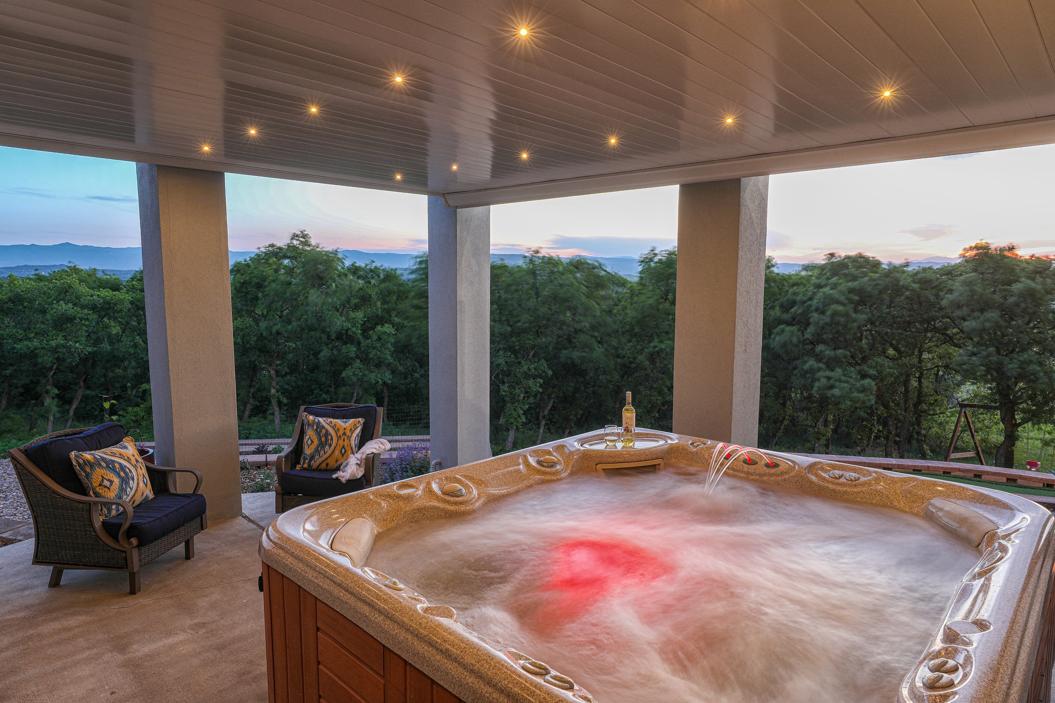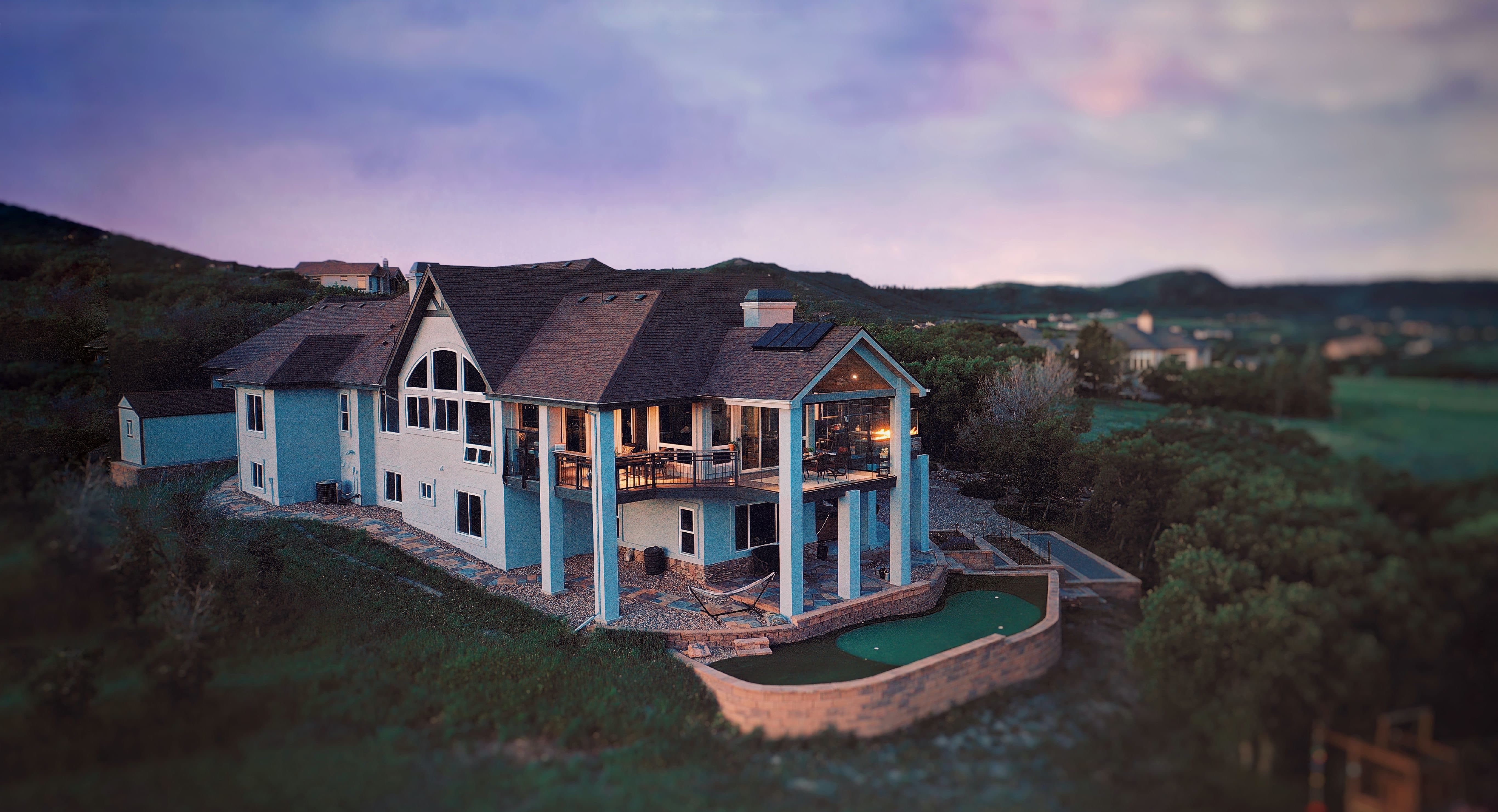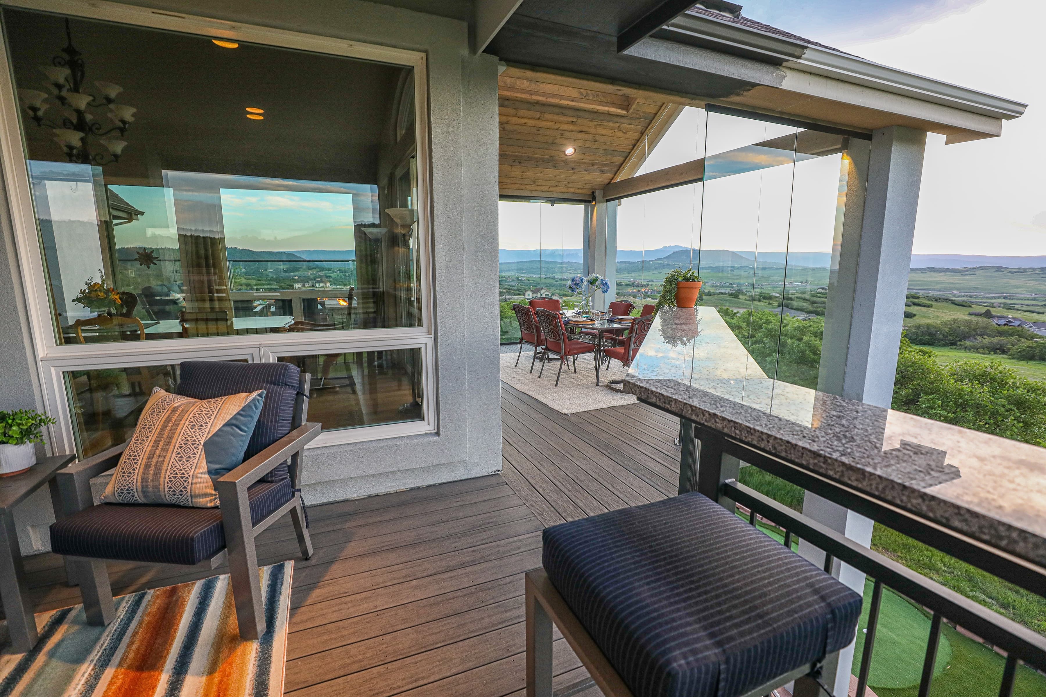 This home has incredible unobstructed views but wind and weather kept the homeowners from using their existing deck. By updating and refining the original space, the family can now enjoy the stunning vistas they fell in love with. Featuring glass walls, timber ceilings with a large skylight, and an infinity style corner fire feature, these clients can now enjoy this impressive Masterpiece every season of the year.